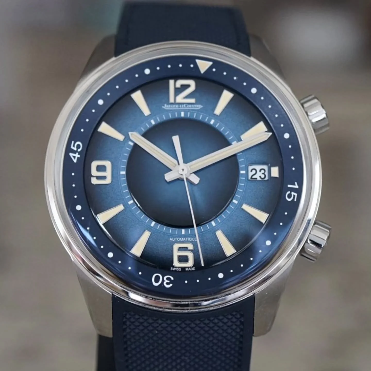 Cal. 285 mechanical jeweled movement, cream dial, luminous Arabic numerals, luminous hands, outer minute divisions, outer blue tachometer scale, four engine-turned subsidiary dials for constant seconds, 12 hour and 30 minute registers, Case back and movement signed, Excellent condition, No box or papers